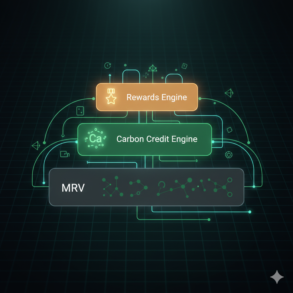 Converts verified sustainability actions into auditable, tradeable carbon credits. Credits are traceable, protected from double counting, and owned by the correct party.