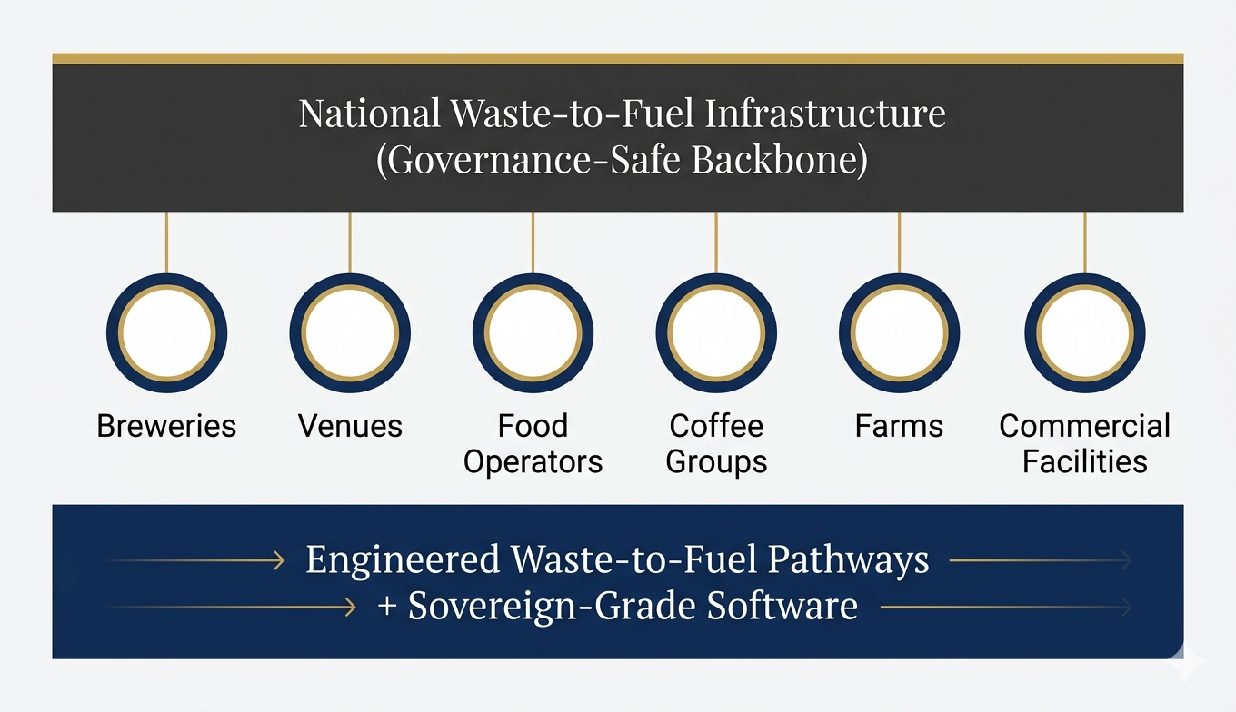 This infrastructure integrates engineered conversion pathways, real‑time sensing, and a centralised data backbone to create a unified national system. Hospitality is the first test bed due to its density, diversity, and operational rhythm.